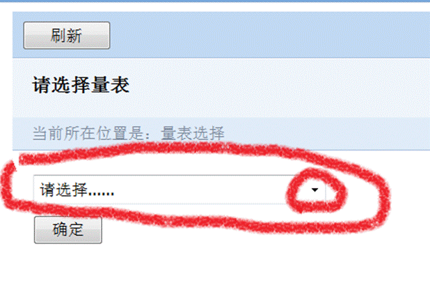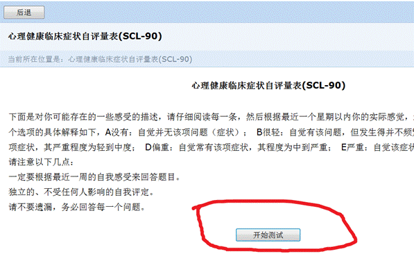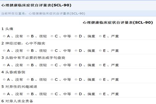 3.在选择量表栏下拉菜单选择“心理健康临床症状自评测验(SCL-90)”,点击“确定”,进入测评页面。