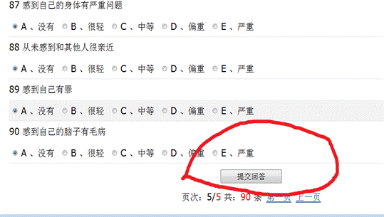 4.阅读指导语之后,开始测试。此测试共90题,每题有5个被选答案,根据自己的实际情况选择作答,做完一页点击“下一页”,如果本页有未完成题目,则会弹出提示“第*、*、*题未完成”,题目完成后点击“提交回答”,弹出对话框显示“提交成功”,测试完成。